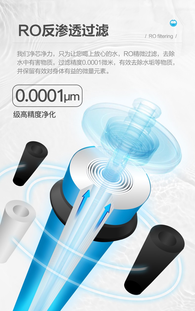 • 凈水方式:RO反滲透(800G,五級過濾通用濾芯),配置壓力儲水罐